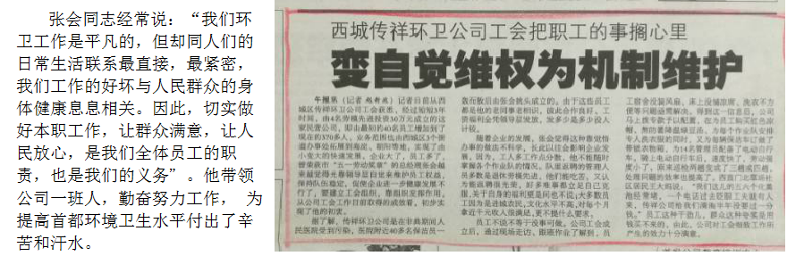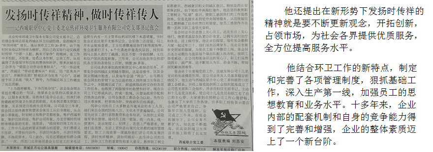 張會(huì)的事跡還在西城職工中心《招工招聘報(bào)》黨工委??褪锌偣?huì)《勞動(dòng)午報(bào)》上作了報(bào)導(dǎo)。由于張會(huì)同志以身作則、身先士卒,也極大的調(diào)動(dòng)和激發(fā)了公司黨員、干部、職工的工作積極性。